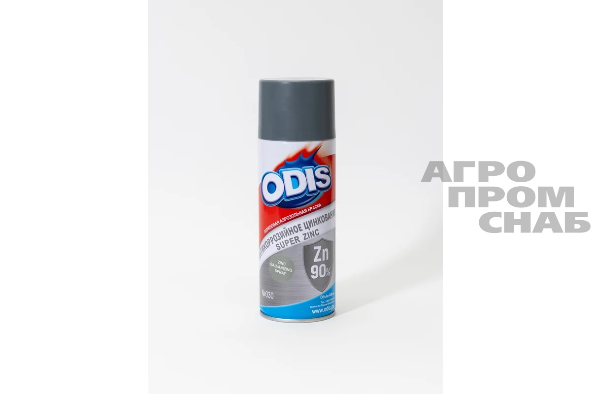 Краска-спрей супер цинк 90_ ODIS 030 (цинковое антикоррозионное покрытие Zn 90%) - предназначена для восстановления поврежденного покрытия из горячего цинкования, замены горячего цинкования, антикоррозионной и декоративной обработки, грунтования металлических поверхностей перед покраской.