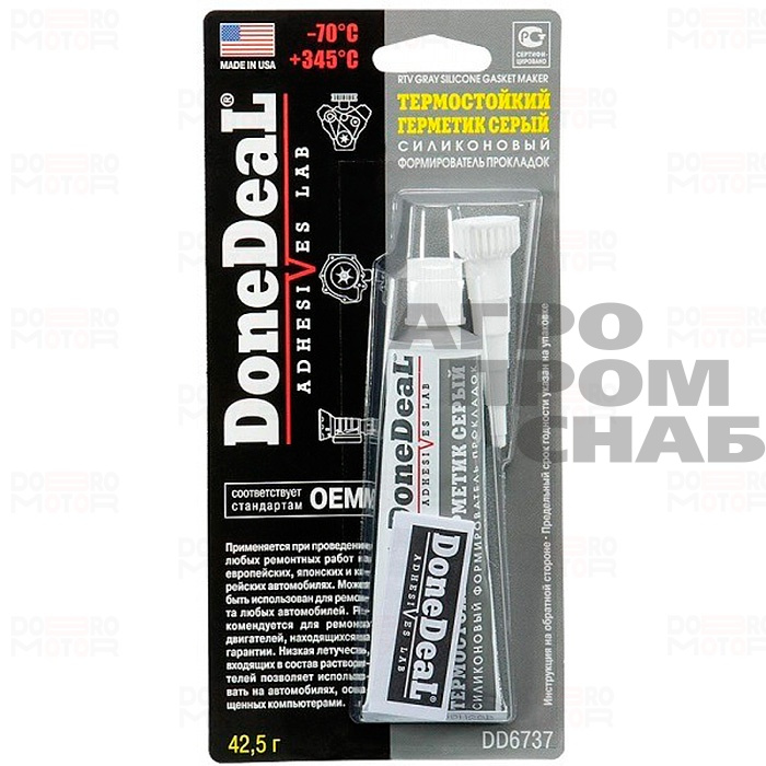 ОЕМ Термостойкий серый силиконовый формирователь прокладок (42.5 г) Done Deal DD6737. Термостойкий герметик с относительно небольшой вязкостью и повышенной водостойкостью, специально разработанный для ремонта автомобилей европейского, японского и корейского производства. Термостойкий герметик для ремонтных работ, вулканизирующийся при комнатной температуре. После вулканизации сохраняет эластичность и приобретает водостойкость.
